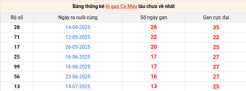 Bảng thống kê lô gan Cà Mau lâu về nhất 20/10/2025