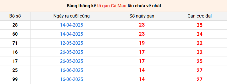 Bảng thống kê lô gan Cà Mau lâu về nhất 29/9/2025