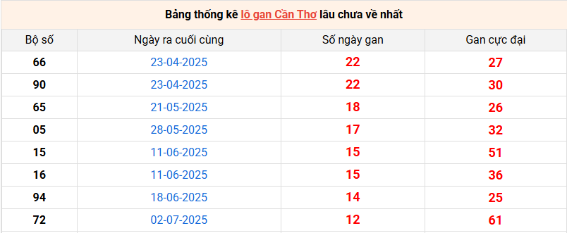 Bảng thống kê lô gan Cần Thơ lâu về nhất 01/10/2025