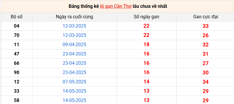 Bảng thống kê lô gan Cần Thơ lâu về nhất 20/8/2025