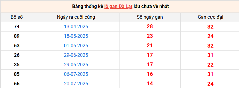 Bảng thống kê lô gan Đà Lạt lâu về nhất
