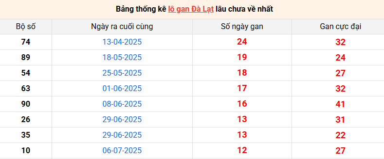 Bảng thống kê lô gan Đà Lạt lâu về nhất