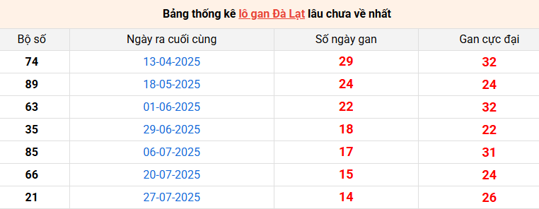 Bảng thống kê lô gan Đà Lạt lâu về nhất