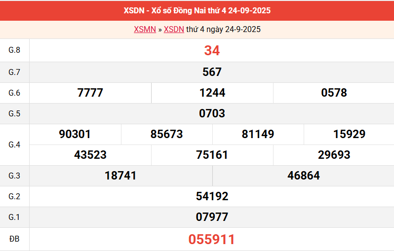 Bảng kết quả Đồng Nai ngày 24/9/2025 tuần trước