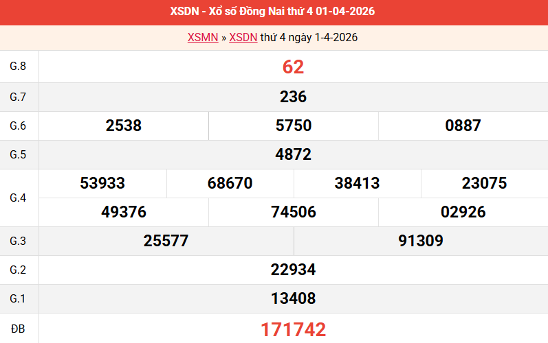 Bảng kết quả Đồng Nai ngày 01/04/2026 tuần trước