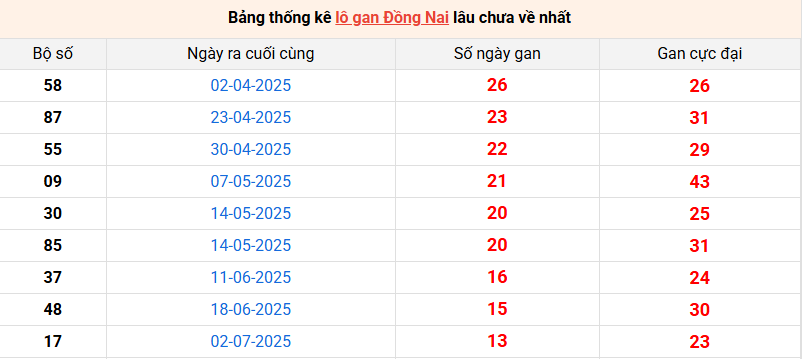 Bảng thống kê lô gan Đồng Nai lâu về nhất 08/10/2025