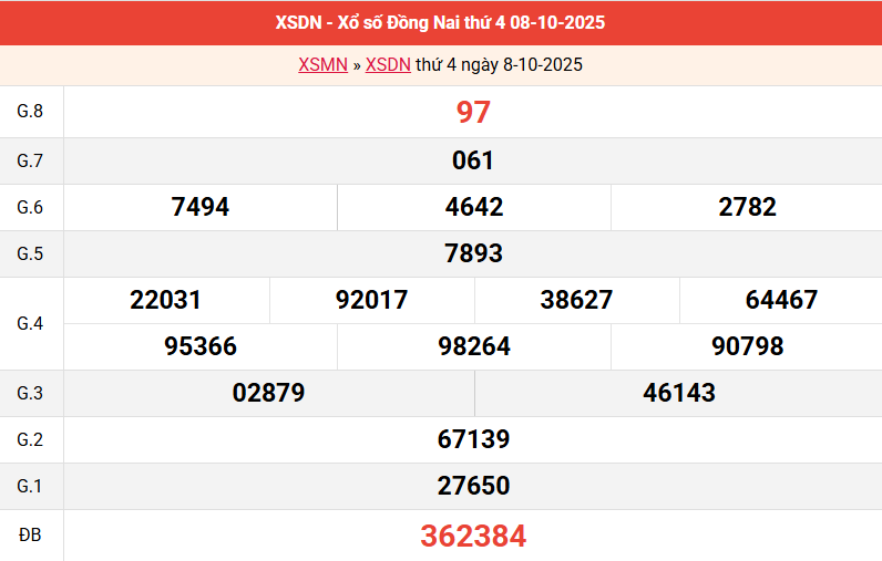 Bảng kết quả Đồng Nai ngày 08/10/2025 tuần trước