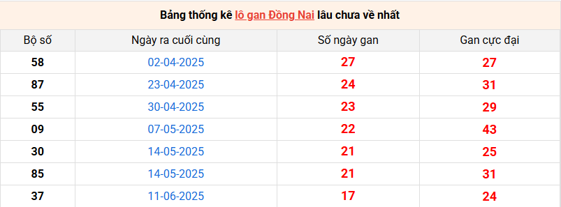 Bảng thống kê lô gan Đồng Nai lâu về nhất 15/10/2025
