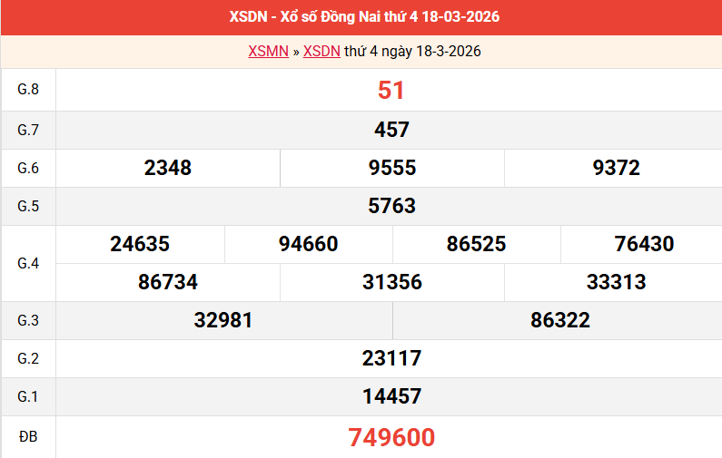 Bảng kết quả Đồng Nai ngày 18/03/2026 tuần trước