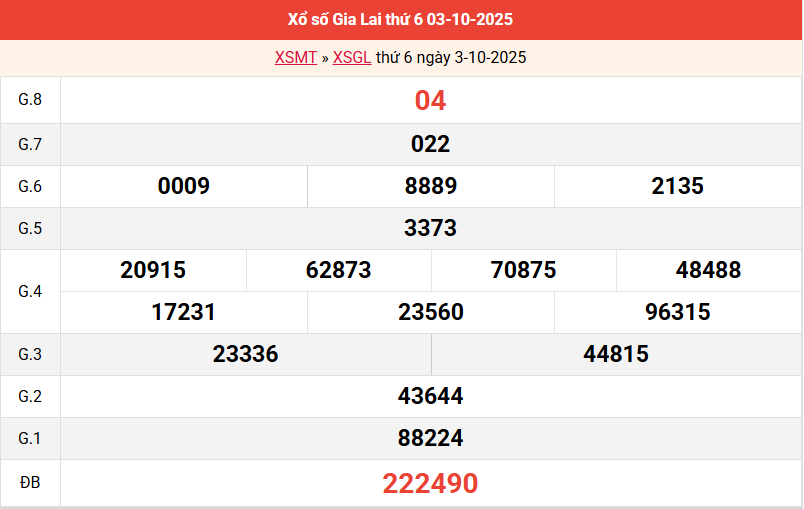 Mời các bạn xem lại bảng kết quả kỳ trước với giải đặc biệt, giải tám, lô tô 2 số để có thể đưa ra nhận định dự đoán GL ngày 10/10 năm 2025 chuẩn xác nhất.