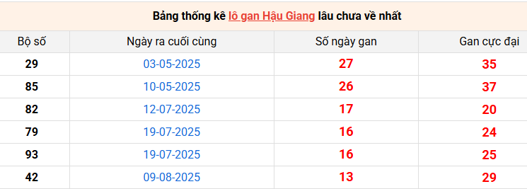 Bảng thống kê lô gan Hậu Giang lâu về nhất 15/11/2025