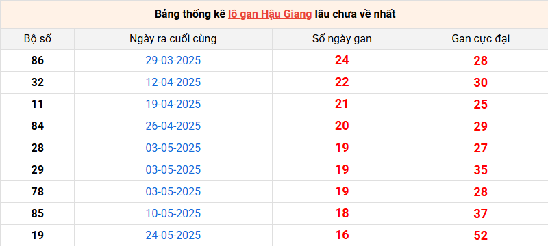 Bảng thống kê lô gan Hậu Giang lâu về nhất 20/9/2025