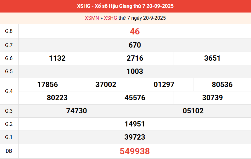 Bảng kết quả Hậu Giang ngày 20/9/2025 tuần trước