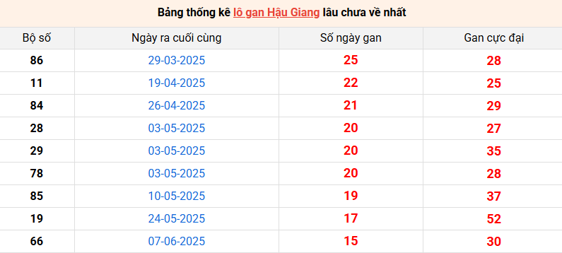 Bảng thống kê lô gan Hậu Giang lâu về nhất 27/9/2025