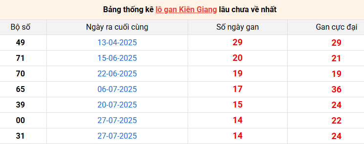 Bảng thống kê lô gan Kiên Giang lâu về nhất 09/11/2025