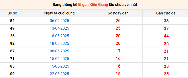 Bảng thống kê lô gan Kiên Giang lâu về nhất 12/10/2025