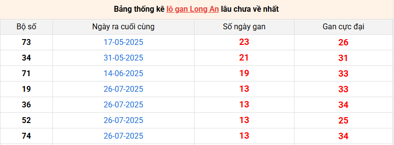 Bảng thống kê lô gan Long An lâu về nhất 01/1/2025
