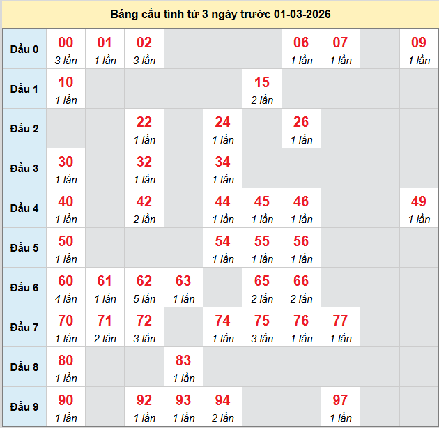 Thống kê cầu hôm nay giúp người chơi có thêm dữ liệu khi phân tích và dự đoán kỳ này được chính xác hơn. Trước khi đến với thống kê, mời các bạn theo dõi lại bảng kết quả kỳ trước để có cái nhìn bao quát hơn về vị trí các con số đã xuất hiện.