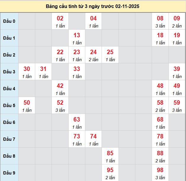 Thống kê soi cầu Miền Nam ngày 02/11 năm 2025 ba đài mở thưởng chiều tối nay chính xác. Những bộ số xuất hiện đều được ghép từ các vị trí trong bảng kết quả từng tỉnh với biên độ thời gian lô rơi liên tục 3 kỳ liên tiếp giúp bạn săn cầu đẹp, bao lô chắc trúng.