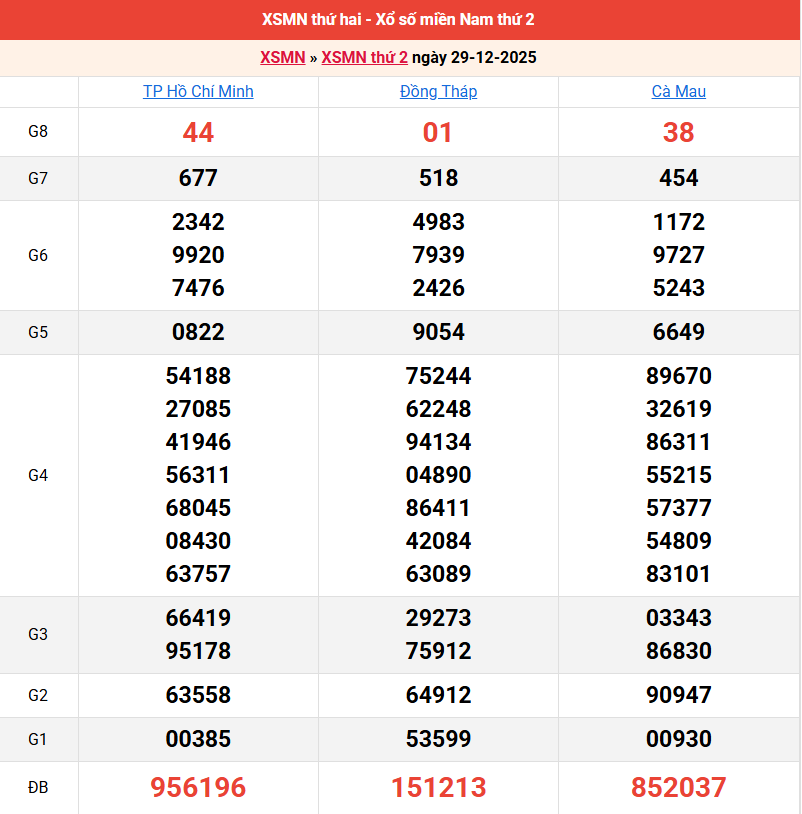 Bảng kết quả kỳ trước 29/12/2025