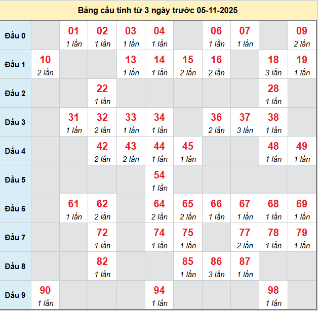 Thống kê cầu hôm nay giúp người chơi có thêm dữ liệu khi phân tích và dự đoán kỳ này được chính xác hơn. Trước khi đến với thống kê, mời các bạn theo dõi lại bảng kết quả kỳ trước để có cái nhìn bao quát hơn về vị trí các con số đã xuất hiện.