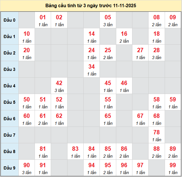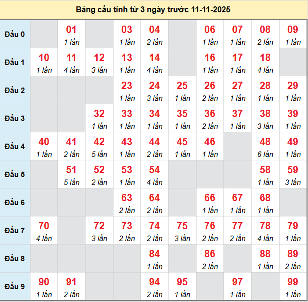 Thống kê cầu hôm nay giúp người chơi có thêm dữ liệu khi phân tích và dự đoán kỳ này được chính xác hơn. Trước khi đến với thống kê, mời các bạn theo dõi lại bảng kết quả kỳ trước để có cái nhìn bao quát hơn về vị trí các con số đã xuất hiện.