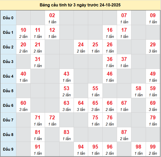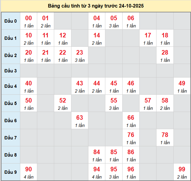 Thống kê cầu hôm nay giúp người chơi có thêm dữ liệu khi phân tích và dự đoán kỳ này được chính xác hơn. Trước khi đến với thống kê, mời các bạn theo dõi lại bảng kết quả thứ 6 kỳ trước để có cái nhìn bao quát hơn về vị trí các con số đã xuất hiện.