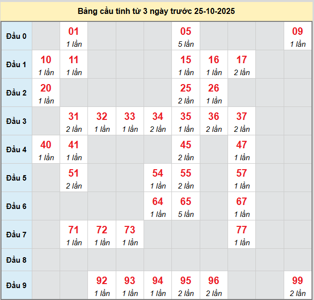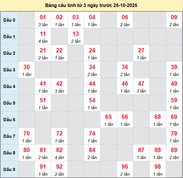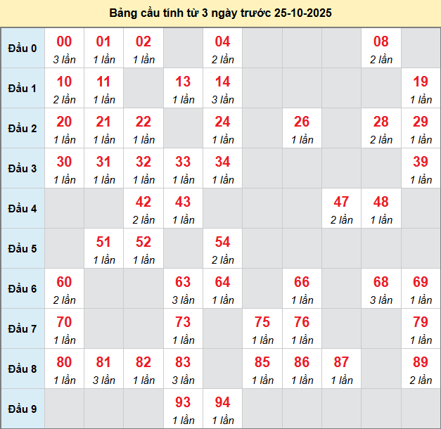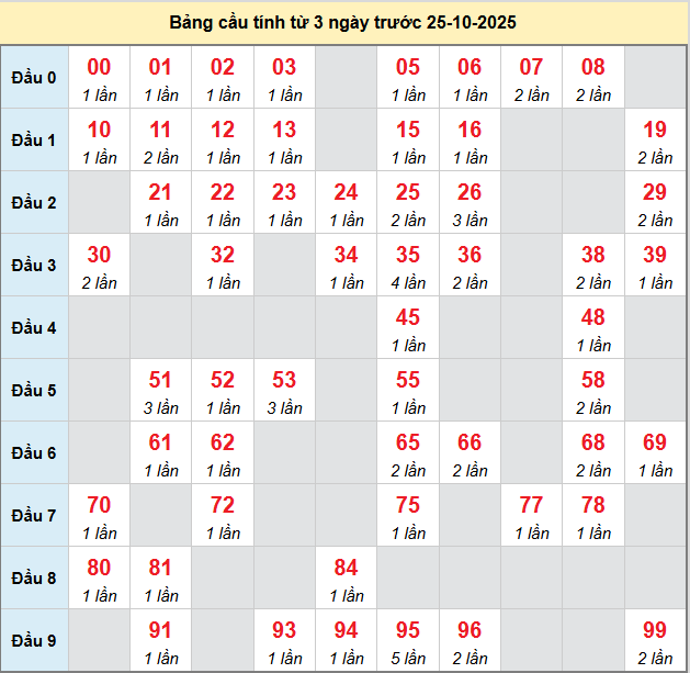 Mời bạn tham khảo bảng thống kê cầu bạch thủ MN dưới đây để chọn được các cặp lô dự đoán miền Nam 25/10 chuẩn nhất.