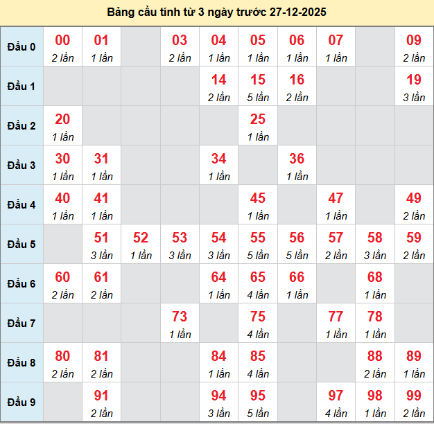 Mời bạn tham khảo bảng thống kê cầu bạch thủ MN dưới đây để chọn được các cặp lô dự đoán miền Nam 27/12 chuẩn nhất.