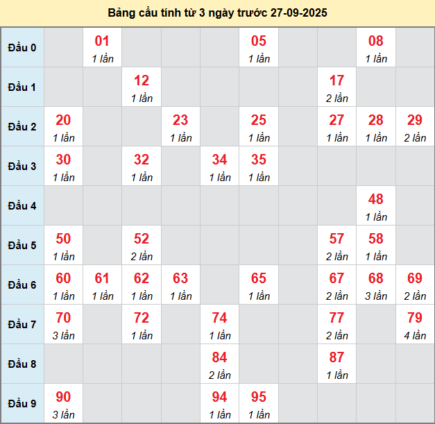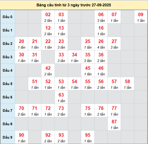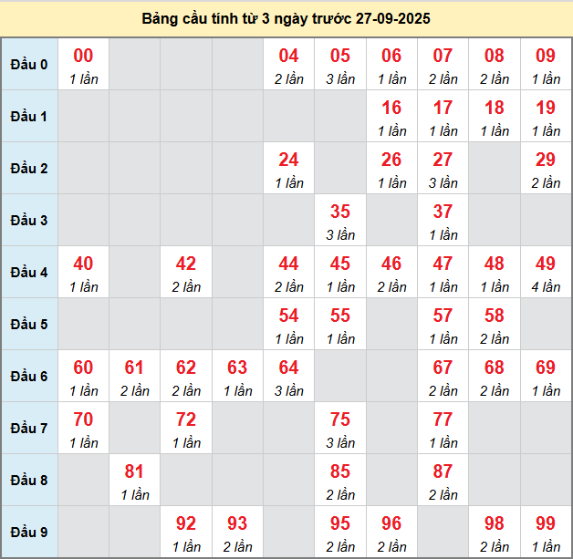 Mời bạn tham khảo bảng thống kê cầu bạch thủ MN dưới đây để chọn được các cặp lô dự đoán miền Nam 27/9 chuẩn nhất.
