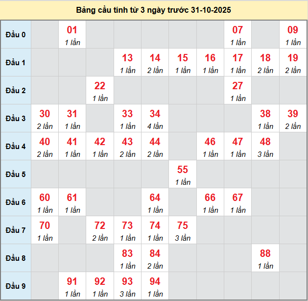 Thống kê cầu hôm nay giúp người chơi có thêm dữ liệu khi phân tích và dự đoán kỳ này được chính xác hơn. Trước khi đến với thống kê, mời các bạn theo dõi lại bảng kết quả thứ 6 kỳ trước để có cái nhìn bao quát hơn về vị trí các con số đã xuất hiện.