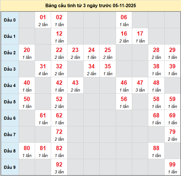 Thống kê cầu hôm nay giúp người chơi có thêm dữ liệu khi phân tích và dự đoán kỳ này được chính xác hơn. Trước khi đến với thống kê, mời các bạn theo dõi lại bảng kết quả kỳ trước để có cái nhìn bao quát hơn về vị trí các con số đã xuất hiện.