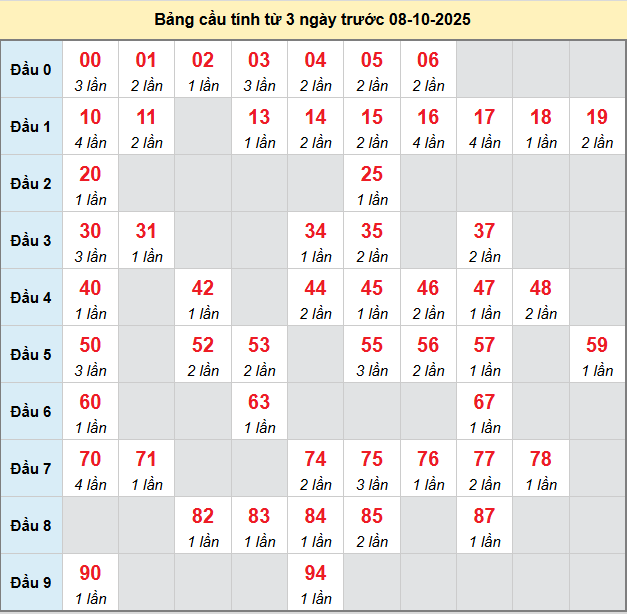 Thống kê cầu hôm nay giúp người chơi có thêm dữ liệu khi phân tích và dự đoán kỳ này được chính xác hơn. Trước khi đến với thống kê, mời các bạn theo dõi lại bảng kết quả kỳ trước để có cái nhìn bao quát hơn về vị trí các con số đã xuất hiện.