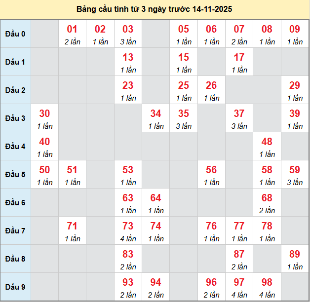 Thống kê cầu hôm nay giúp người chơi có thêm dữ liệu khi phân tích và dự đoán kỳ này được chính xác hơn. Trước khi đến với thống kê, mời các bạn theo dõi lại bảng kết quả thứ 6 kỳ trước để có cái nhìn bao quát hơn về vị trí các con số đã xuất hiện.