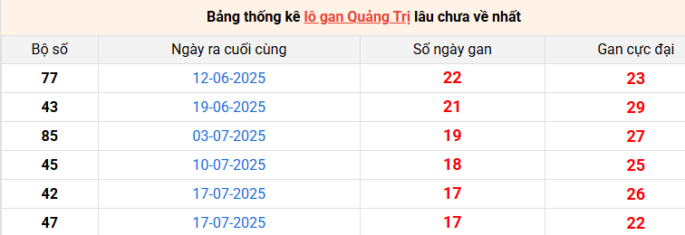 Bảng thống kê lô gan Quảng Trị lâu về nhất 20/11/2025