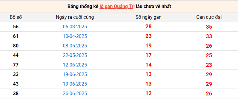 Bảng thống kê lô gan Quảng Trị lâu về nhất 25/9 /2025