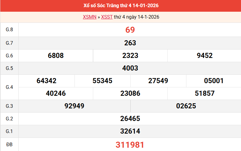 Bảng kết quả Sóc Trăng ngày 14/01/2026 tuần trước