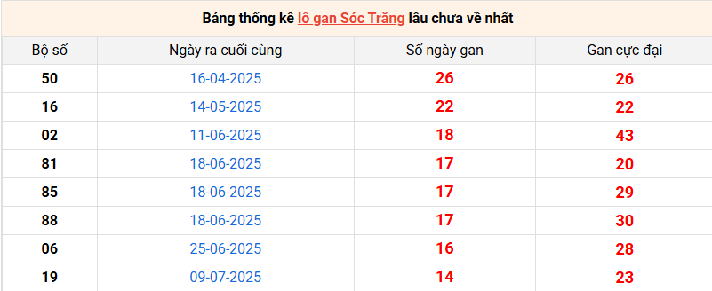 Bảng thống kê lô gan Sóc Trăng lâu về nhất 22/10/2025