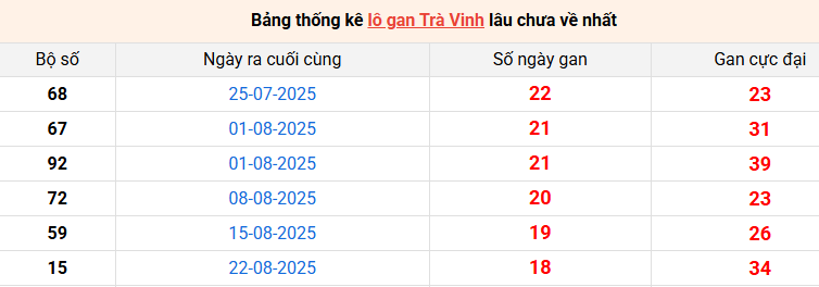 Bảng thống kê lô gan Trà Vinh lâu về nhất