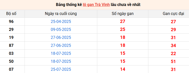 Bảng thống kê lô gan Trà Vinh lâu về nhất 07/11/2025