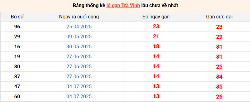 Bảng thống kê lô gan Trà Vinh lâu về nhất 10/10/2025