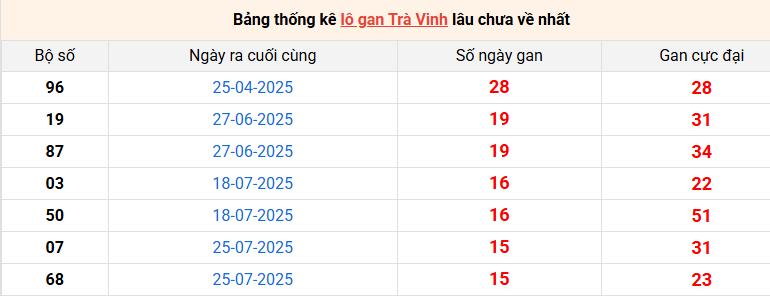 Bảng thống kê lô gan Trà Vinh lâu về nhất 14/11/2025