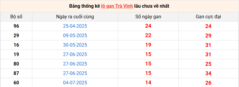 Bảng thống kê lô gan Trà Vinh lâu về nhất 17/10/2025