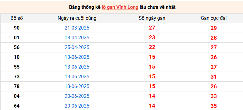 Bảng thống kê lô gan Vĩnh Long lâu về nhất 03/10/2025