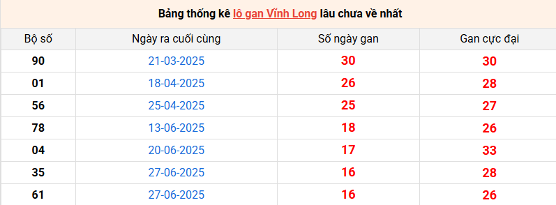 Bảng thống kê lô gan Vĩnh Long lâu về nhất 24/10/2025