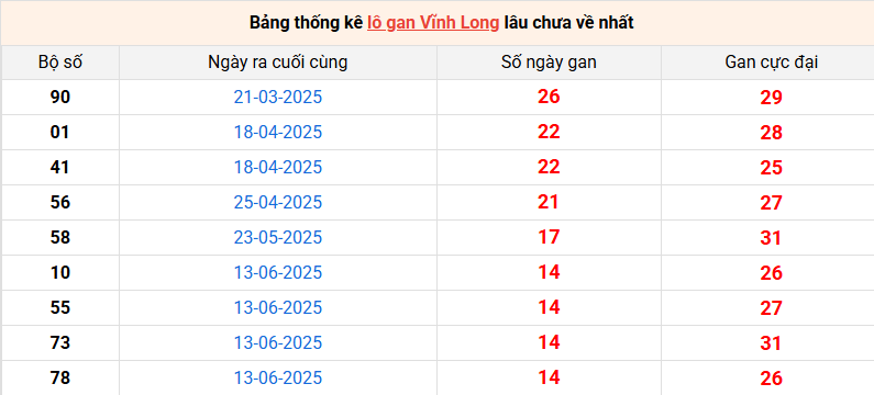 Bảng thống kê lô gan Vĩnh Long lâu về nhất 26/9/2025