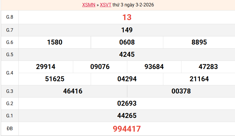 Bảng kết quả Vũng Tàu ngày 03/02/2026 tuần trước