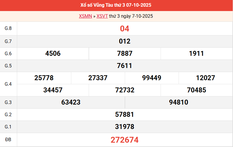 Bảng kết quả Vũng Tàu ngày 07/10/2025 tuần trước