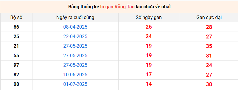 Bảng thống kê lô gan Vũng Tàu lâu về nhất 14/10/2025