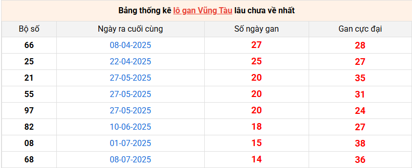 Bảng thống kê lô gan Vũng Tàu lâu về nhất 21/10/2025